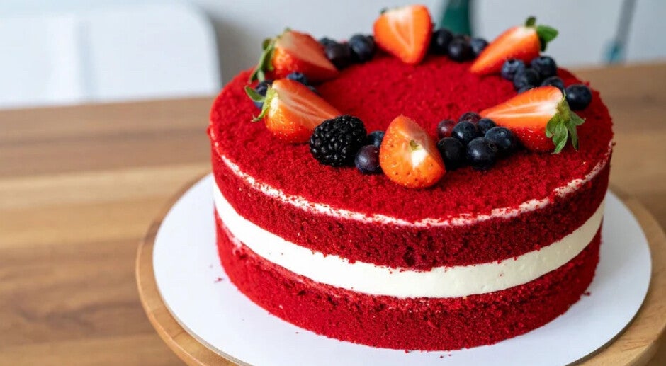 Bizcocho esponjoso con un tono rojizo icónico, relleno con suave crema de queso.